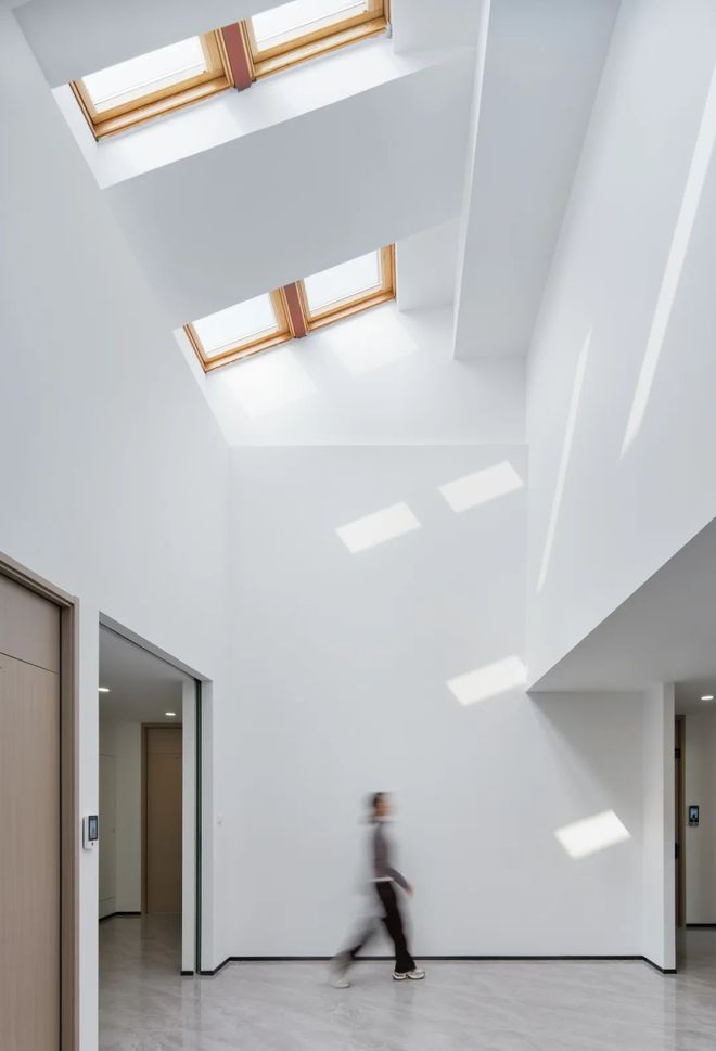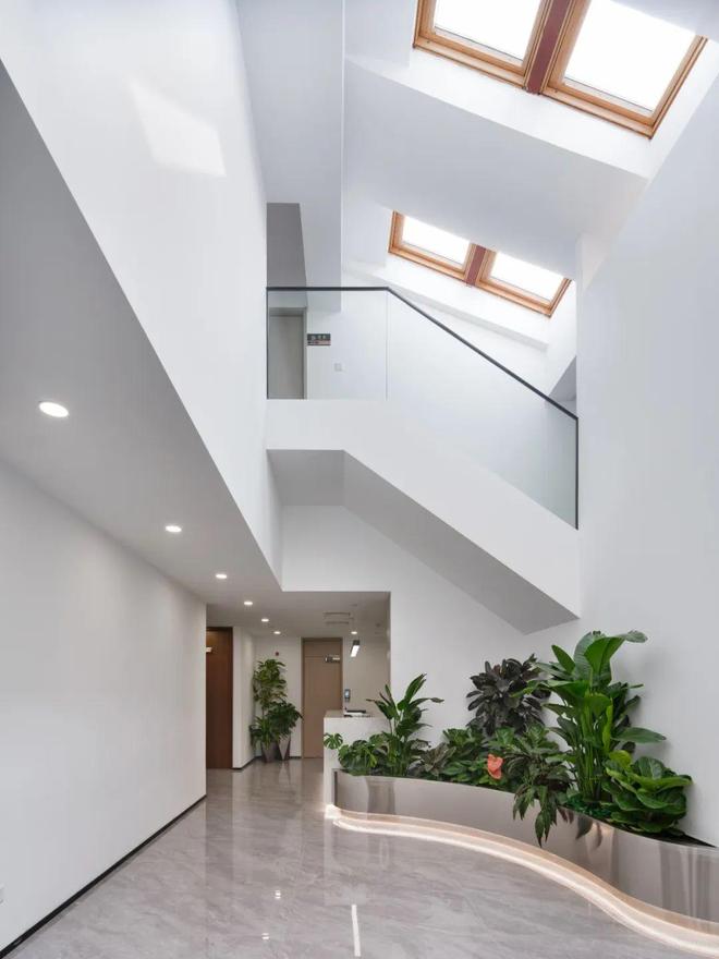 设计师在光环境的营造上进行大胆创意的探索。中庭多层贯穿的挑高设计,顶层开设高窗,随着时间的推移,自然光线在侧墙投下律动的光影,不仅提升空间的通透性,更通过光影的流动,将时间的维度融入空间体验中,赋予空间以生命力,成为情感与记忆的载体,加强了员工独特的归属感。