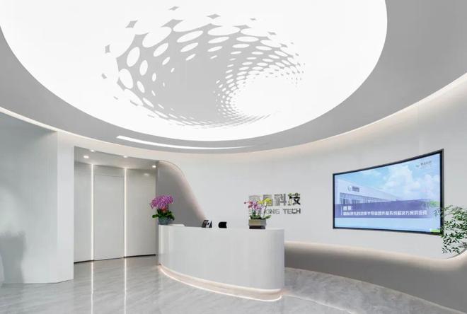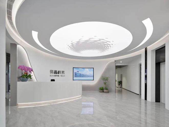 作为整个办公空间的起点,入口接待厅集空间要素整合,企业文化展示及动线引导等多重功能于一体。主体设计以圆和弧线塑造空间的流动感。照明设计采用赛晶科技的LOGO图像,既简约现代又彰显企业形象。
