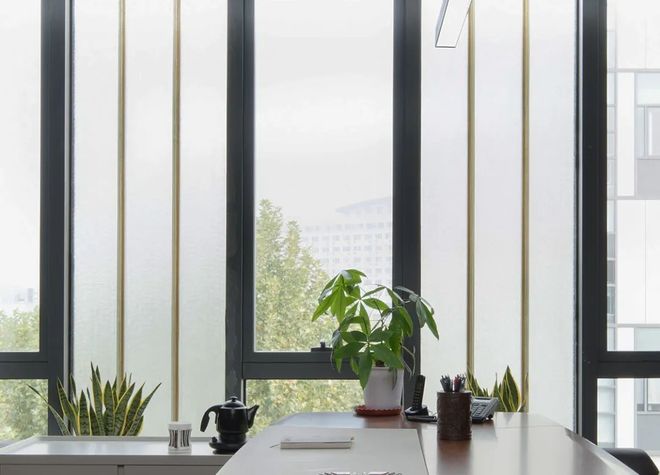 办公楼平面布局为方正空间,西侧为建筑楼梯结构区域,东侧为功能区。室内采光主要依赖东侧幕墙以及南北向侧窗,设计师巧妙的分析利用采光条件,形成室内外景观的联动。