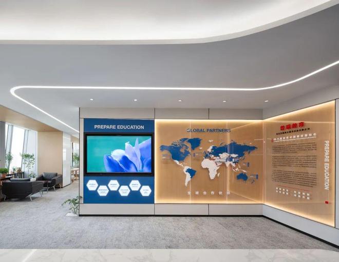 前厅文化展示墙,设计融合实用性与艺术审美,通过色彩、图形、文字等多种元素的搭配,展示普瑞教育的发展历程,全球分布,文化理念与工作成果。营造出一种强烈的视觉冲击力和情感共鸣,吸引访客的目光与关注,彰显企业文化与实力。