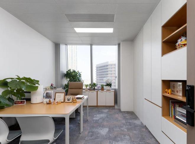 独立办公空间以纯净的白色为基调,营造出通透清新的工作氛围,办公家具精选浅木色系,保留天然的木纹肌理,点缀绿植,形成温馨和谐的办公环境。