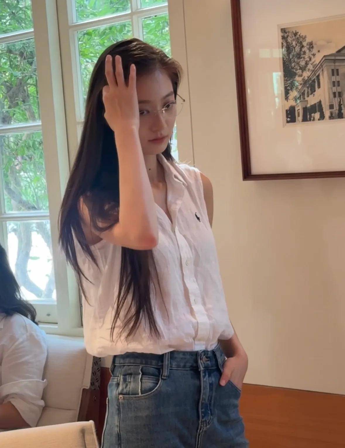 从穿搭看,用心之处并不喧宾夺主。她选择浅灰色的亚麻背心,搭配水洗蓝的直筒牛仔裤,整体既休闲又清新,透出一股利落的气质。无框眼镜成画面点睛,与她标志性的黑长直发相映成趣,给人一种纯净中带着雅致的书卷气。最朴素的单品,在她身上却显得格外有范儿,像小说里走出来的干练女主。