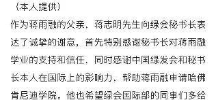 她的父亲是绿发会专项基金执行主任蒋志明,入学哈佛时据传是绿发会秘书长周晋峰推荐。