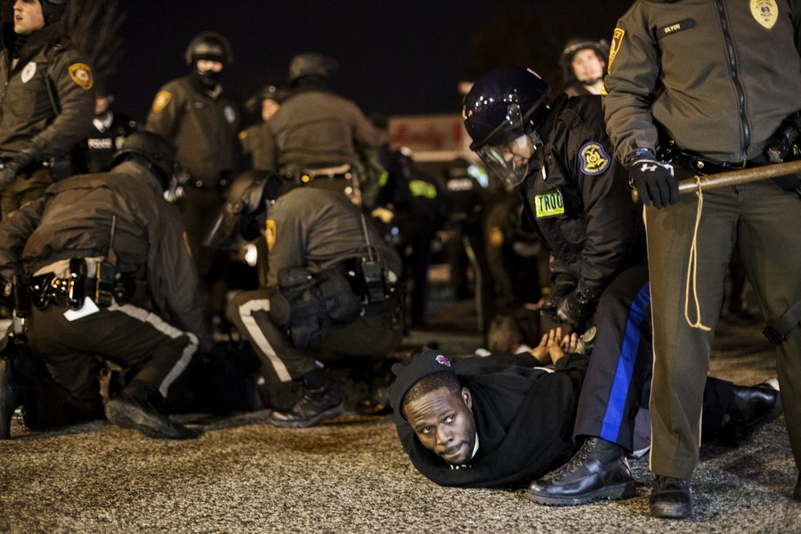 2014年11月28日,在美国密苏里州弗格森警察局前,警察逮捕者。新华社发(吉姆冯德鲁什卡摄)