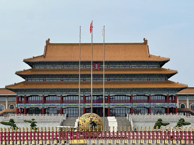 扬子江药业集团总部大楼坐落在泰州市高港区扬子江南路1号,整个建筑群占地面积广阔,包括了中西合璧的多种建筑风格。其中,最引人注目的当属那座酷似故宫的中式建筑。这座建筑采用了黄琉璃瓦顶、青白石底座,整体风格金碧辉煌、气势恢宏。远远望去,仿佛穿越时空回到了古代的皇家宫殿。其基座仿照天坛设计,高58米的钟楼更是成为了当地的地标性建筑。