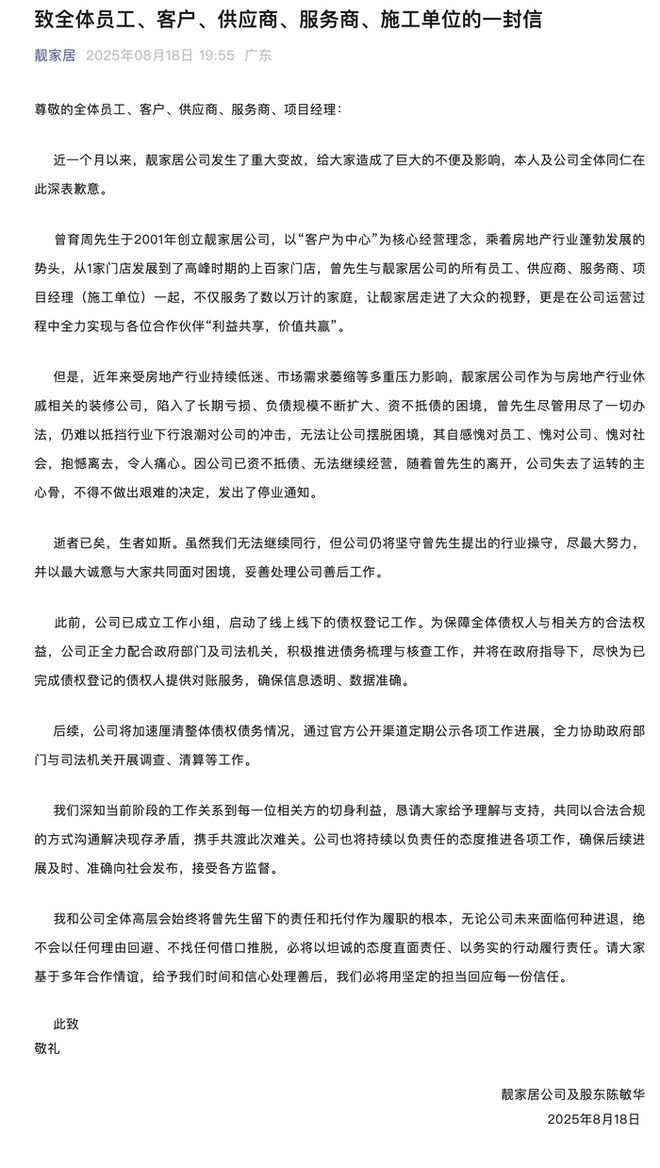 8月18日晚间,靓家居公司及股东陈敏华发布《致全体员工、客户、供应商、服务商、施工单位的一封信》。